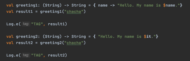 인자가 1개일 경우 선언을 생략할 수 있으며 it 으로 접근 가능합니다.