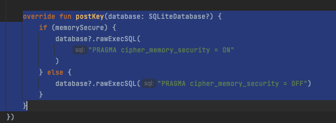 What is the right place to execute PRAGMA cipher_memory_security = OFF;? Can I do it in onUpgrade method? So it will be executed only one time. Or I need to execute it each time I open a database. Can you tell what exactly this pragma does and what is the