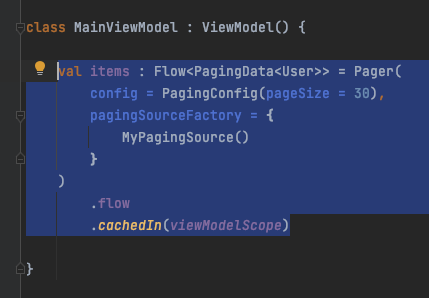 cachedIn() 연산자는 데이터 스트림을 공유 가능하게 하며 제공된 CoroutineScope을 사용하여 로드된 데이터를 캐시합니다. 이 예에서는 Lifecycle lifecycle-viewmodel-ktx 아티팩트가 제공하는 viewModelScope을 사용합니다.