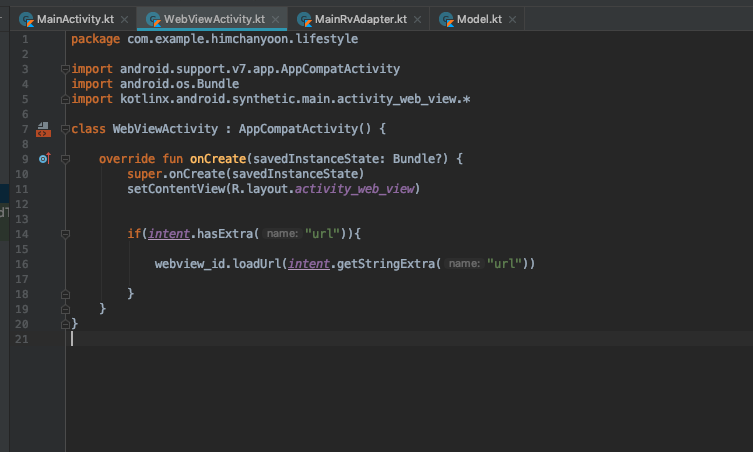 그다음은 WebViewActivity에서 데이터를 받아서 loadUrl로 가져와줍니다.