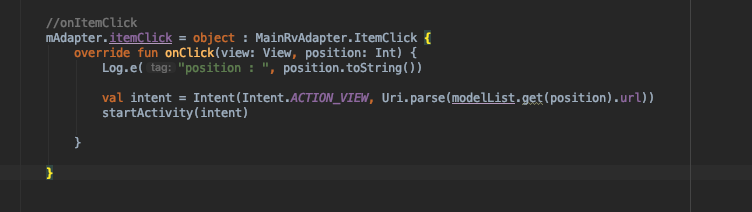 그런 다음, Intent를 이용해 WebViewActivity로 넘겨주는데, url라는 값에 modelList에 있는 url를 하나씩 넣어서 넘겨줍니다.