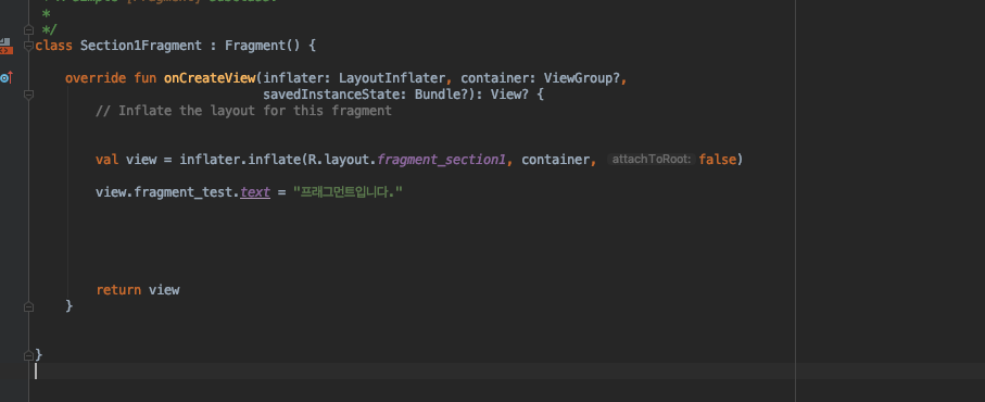 그 다음 섹션1 을 눌렀을 때, fragment가 나타나도록 처리해주면 끝