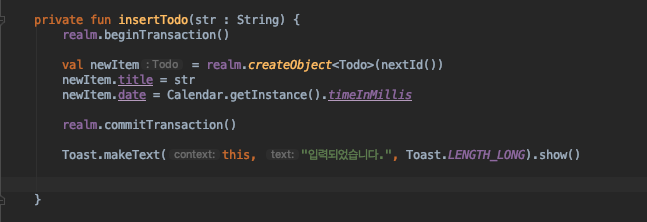 그 다음, dialog에서 입력한 값을 받아와서, Realm에 넣어줍니다.