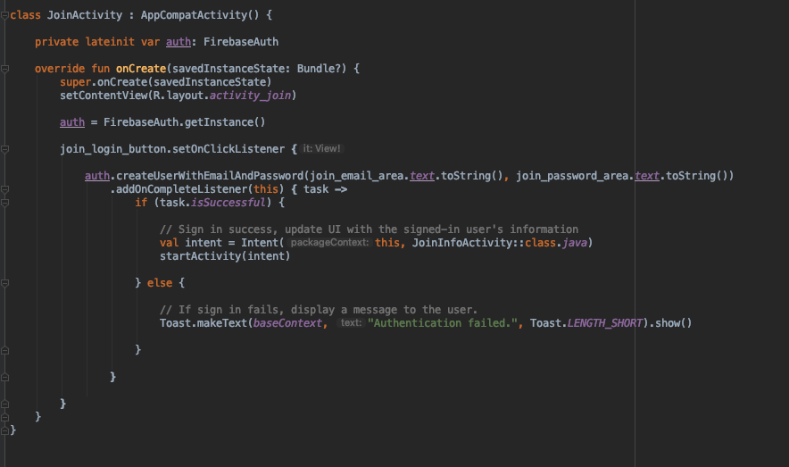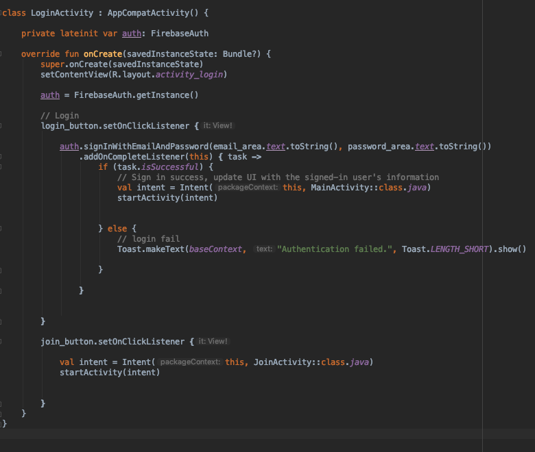 일단 LoginActivity로 와서 singInWithEmailAndPassword 만들어주고