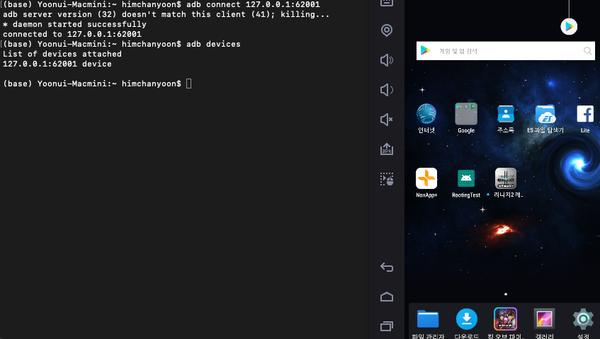 자, 그 다음 adb connection을 통해서 녹스 앱 플레이어랑 연결해주고