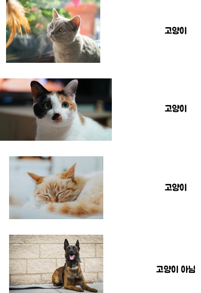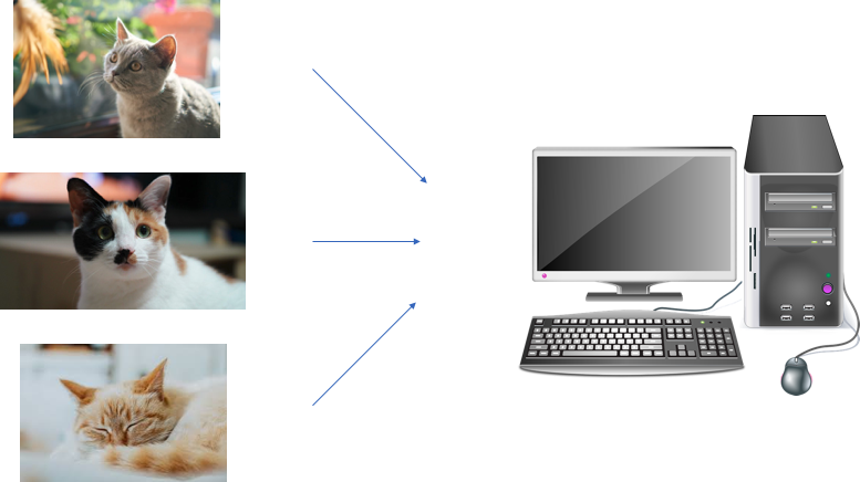 아래의 사진에서 보듯이 컴퓨터에게 이런 사진들을 보여주고 이게 "고양이"다 이게 "고양이가 아니다"라고 알려줍니다.