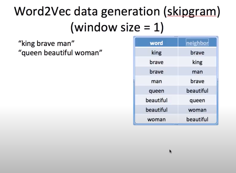 word2vec은 skipgram이라는 것을 사용해서 컴퓨터가 word와 neighbor를 만들 수 있습니다.